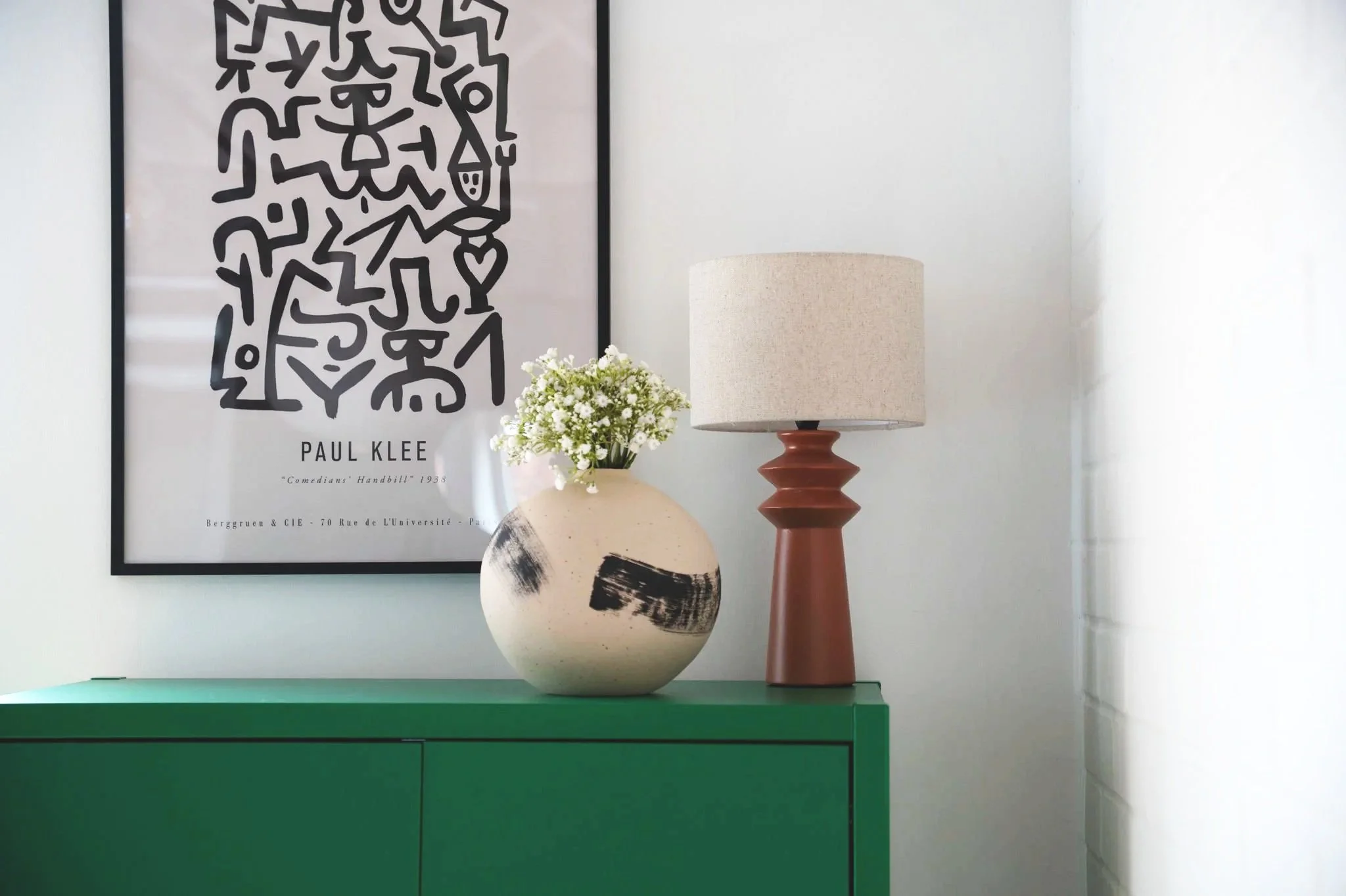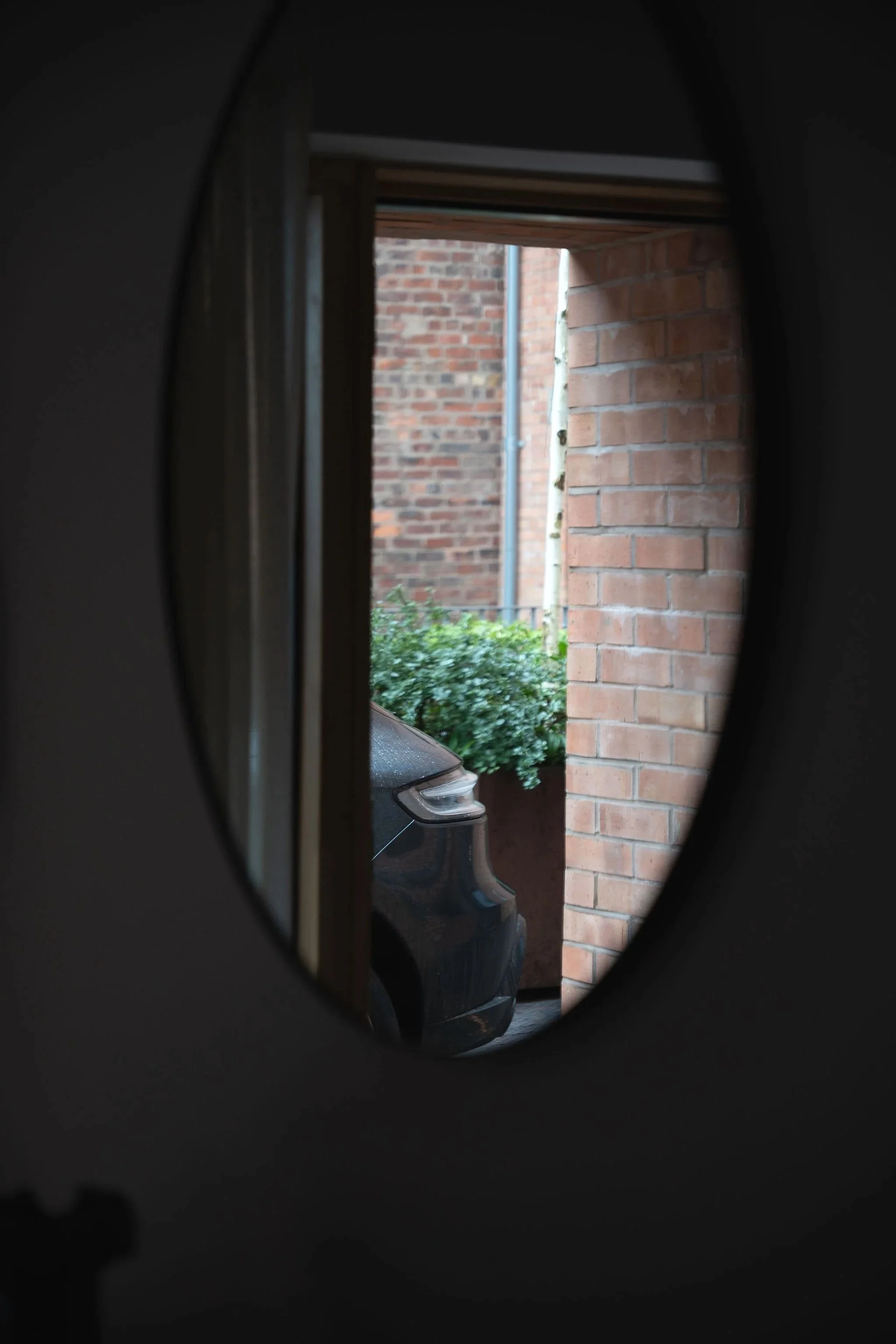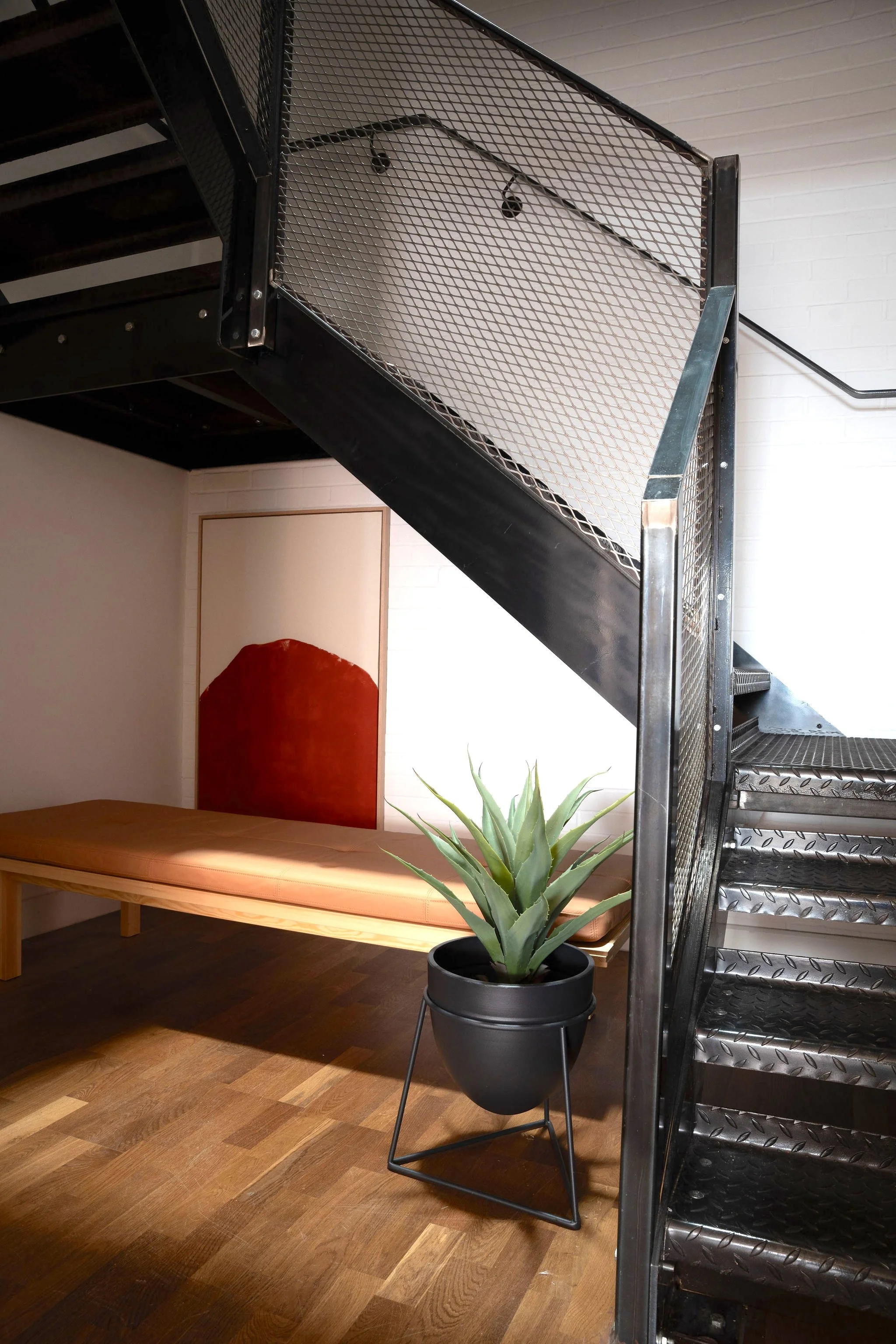 Beyond the apartments, we were invited to shape key communal and exterior spaces. Courtyards now blend steel, brick, and soft planting to create quiet urban oases, while circular stone details and original machine belt wheels reference the site’s button-making heritage. Jewel-green apartment doors harmonise with the brickwork, and hand-painted signage and murals inspired by historical adverts and original painted signs proudly mark the building’s new identity.